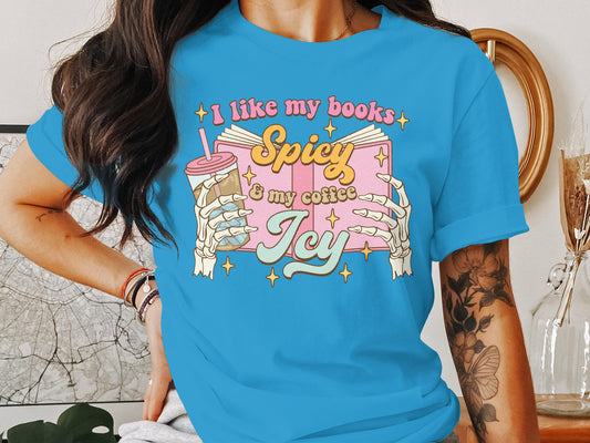 Book Lover T-Shirt, Spicy Books Icy Coffee Graphic Tee, Reading Enthusiast Casual Top, Unisex Shirt for Bibliophiles