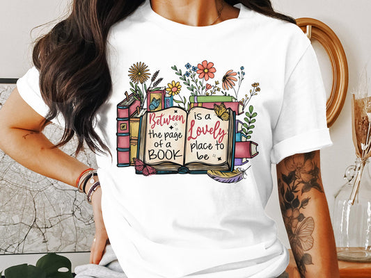 Unique Book Lover T-Shirt, Floral Books Design, Cozy Reading Tee, Literary Gift, Between the Page is a Lovely Place to Be Top