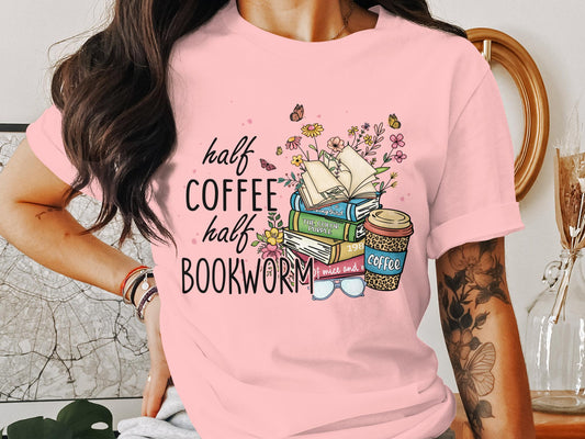 Book Lover Coffee Enthusiast T-Shirt, Half Coffee Half Bookworm Graphic Tee, Reading and Cafe Unisex Shirt, Gift for Readers and Writers