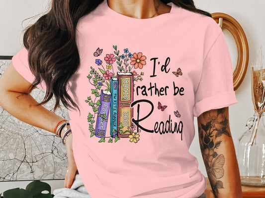 Women's Book Lover T-Shirt, I'd Rather Be Reading, Floral Stack of Books Graphic Tee, Gift for Readers, Bibliophile Top