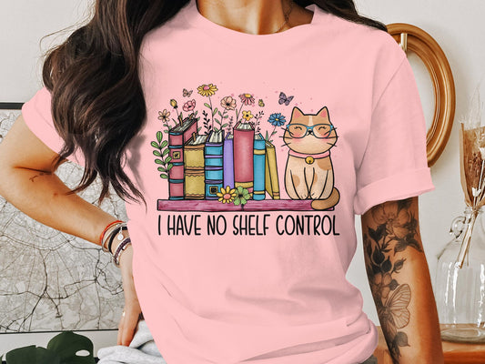 Cat Lover Bookshelf T-Shirt, I Have No Shelf Control Pun Tee, Colorful Books and Butterflies, Unisex Bookish Graphic Shirt