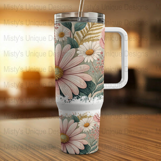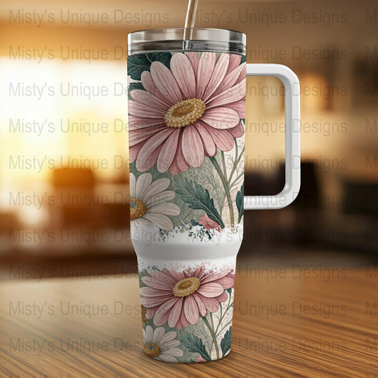 Vintage Daisy Floral 40oz Tumbler Wrap, Botanical Flower Print, Pastel Pink and White Blooms, Nature Inspired Tumbler Wrap Design