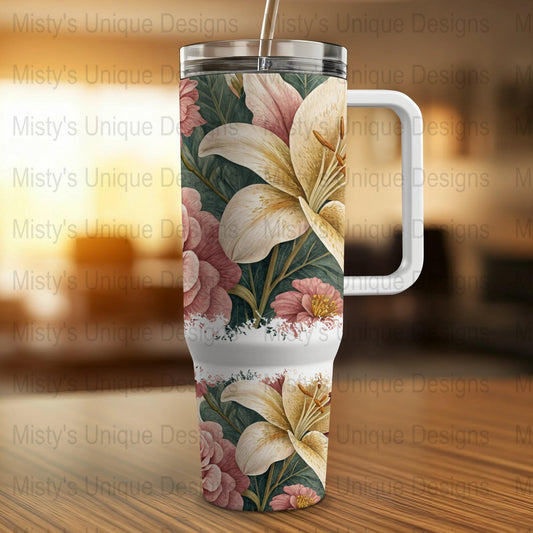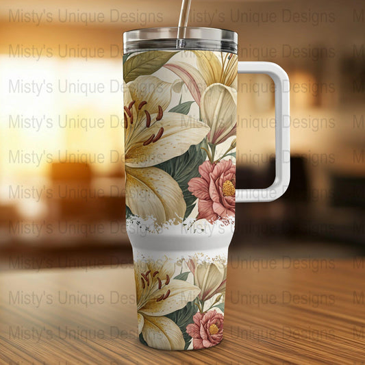 Vintage Floral 40oz Tumbler Wrap, Watercolor Lily and Peony Design, Elegant Flower Tumbler Cover, Botanical Art Tumbler Wrap