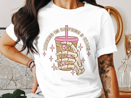 Running on Caffeine and Chaos Coffee T-Shirt, Vintage Style Graphic Tee, Casual Women's Shirt, Coffee Lover Gift, Soft Cotton Top