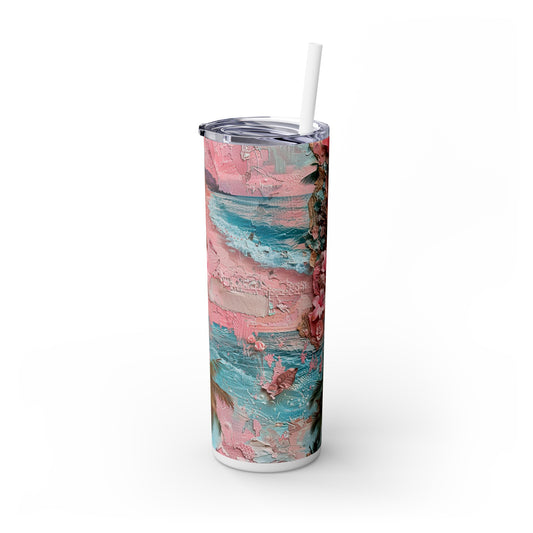 Pink Paradise Beach Collage Design Skinny Tumbler with Straw, 20oz